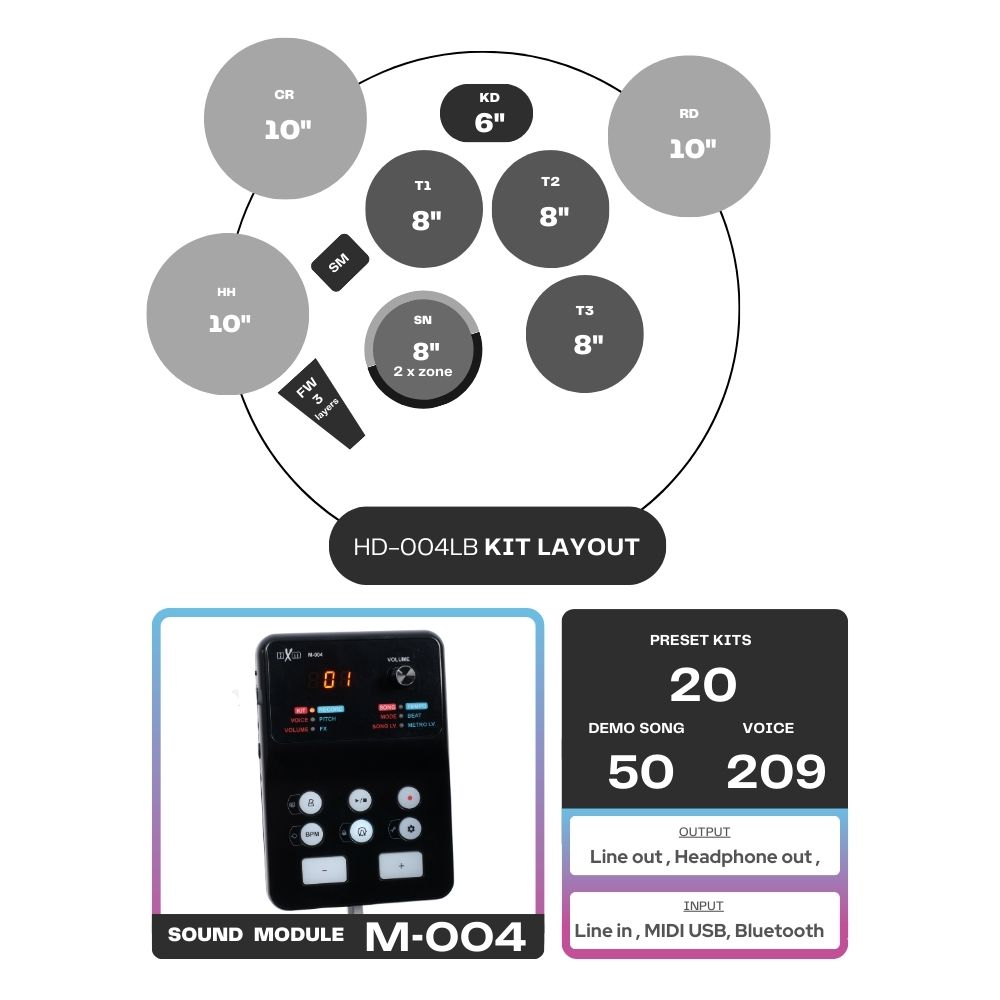 HXM HD-004LB Electronic Drum Kit กลองไฟฟ้ารุ่นยอดนิยมที่ตอบโจทย์ทั้งมือใหม่และมือซ้อมจริงจัง มาพร้อมแป้นกลองหนังมุ้ง (Mesh Head) ให้สัมผัสสมจริง ตอบสนองแรงตีอย่างแม่นยำ พร้อมโมดูลเสียงใช้งานง่าย ครบทั้งฟังก์ชันซ้อม เพลงฝึก และเอฟเฟกต์ Reverb ในตัว รองรับการเชื่อมต่อ Line, Bluetooth และ USB MIDI เพื่อการฝึกและทำเพลงได้อย่างอิสระทุกที่